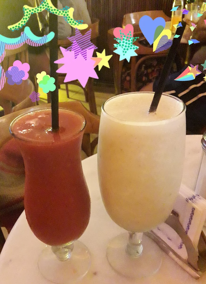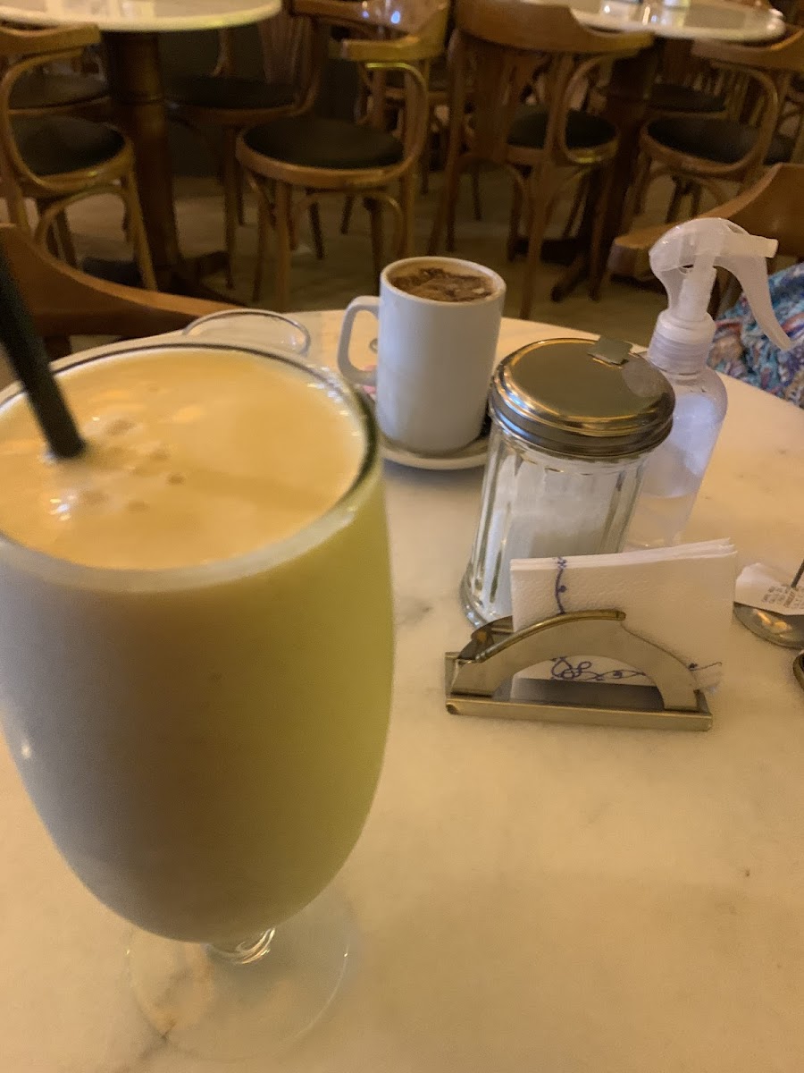 Batido de durazno $400 Capuchino $350 Muy ricas las dos cosas. El mozo muy amable, lindo lugar para tomarse un cafecito en la peatonal.